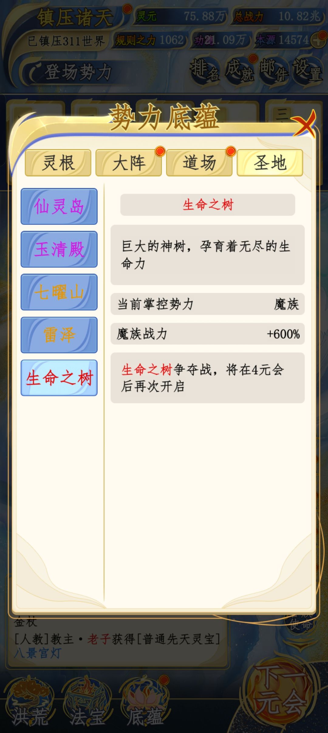 还有个种族三个点能触发寻宝、势力天道信仰、增加战力