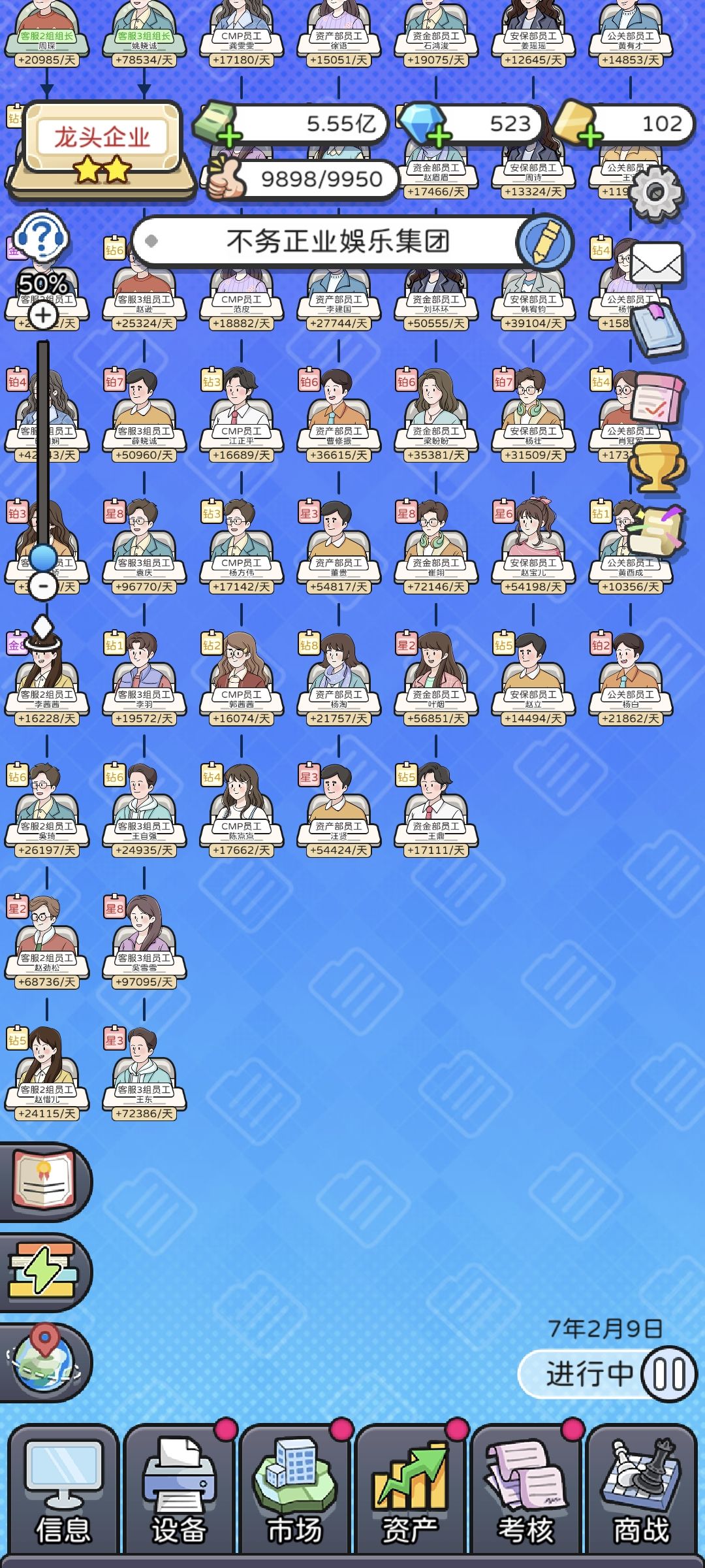 通关总结玩通关了,龙头五星到顶,整体不错,有可玩性,支持!!个人觉得还能再继续延展下去,玩到后面才知道只有四维高才重要,商战只看四维,但四维只靠读书或者升学历提升的快,快速通关就没必要招人 只招十几人刷四维就足够,这样其他模块就没有吸引力点点靴微意见1.可以再往下延伸嘛,后续引进外资,垄断企业等等,不然很快到头了2.建议公司职员人数解除上限,想玩成大厂几千人好壮观,现在上限370还是380人3.建议调岗模式为自动加手动,想让四维高的人做主管,但没法手调