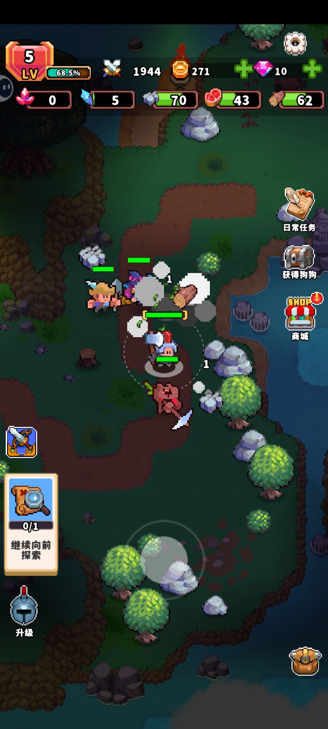 很像轰隆隆佣兵团的RPG游戏,单手指控制摇杆即可操作主英雄,其他队友在周围有可采集资源和怪物的时候,都可以自主行动。有BOSS战斗,比较考验走位技巧。