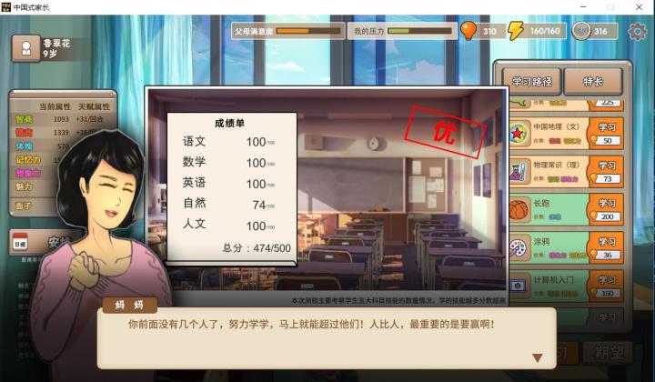 本作最大的特点除了话题性极强的题材外,就是其非常丰富的玩法了,将其形容为一个小游戏的大合集似乎也不为过。虽然在游戏中,玩家的大部分时间都是孩子的视角,自己扮演自己,自己养自己,给人一种“跑题”的感觉,但游戏内丰富的玩法,各种小游戏让每个孩子的成长过程既真(zha)实(xin)又欢乐。过年领红包的客气套路被做成了鼠标QTE,将特长进行数值化的面子对决,不仅接地气而且有一种莫名的魔性和欢乐感。特长比赛、班干部选举、考试,这些内容都有独特的小玩法与之对应,没有重复,可以看出开发团队在玩法方面是很用心了。