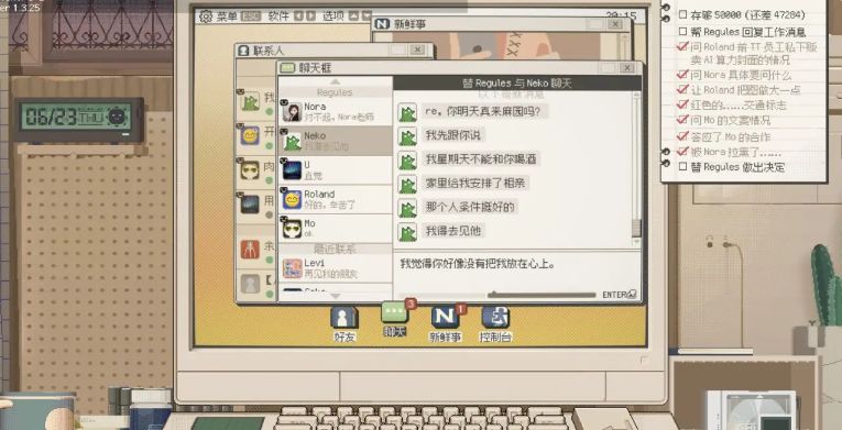 与此同时,游戏中每位求助者的委托实质是以章节制划分开来的,而这些章节两两之间还存在着间幕式的“休息时间”——你可以在这一阶段里走出你的出租屋,下楼眺望一番麻园都市的远景,打趣一下寄宿于自动售货机中的赛博生命,再买些或许只能单纯当作摆设物品带回家——