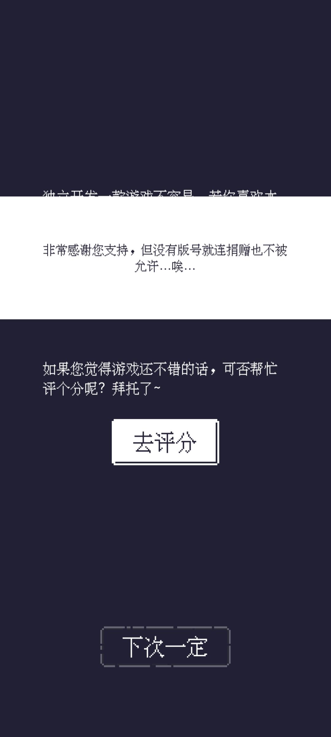神作,虽然体量小,但是讲好了一个末世背景下的故事,通关后,点击打赏作者却被提示没有版号连被打赏都是不允许的,内心真的非常感慨