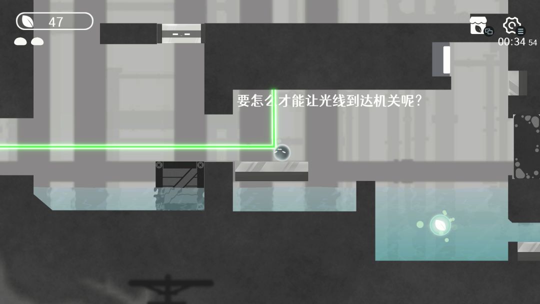 等到了26关以后,又加入了一种激光玩法,玩家的水滴形态与冰块形态对激光的折射角度不同,甚至有些解密需要玩家主动变成云朵撞掉一滴血,玩家操纵的水滴和冰块体积大小发生变化,折射的角度也会相应的变小。