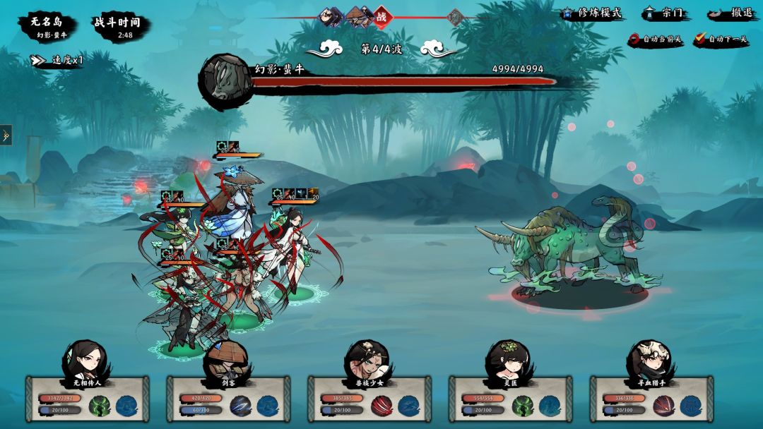游戏战斗是全自动的,系统将自动计算参战双方的出手顺序,然后将其图标排列在界面正上方,随后双方会依次出手,除了普攻外,每个角色还拥有各自的绝招,可以根据血条下方的蓝色进度条来判断当前进度。
