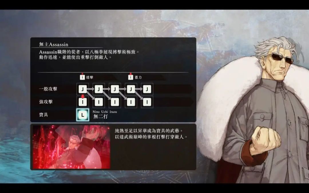 在本作中,最让人意外的是,除了两位主角“宫本伊织”与“Saber”,在游戏过程中,玩家还能时而操控其他有主或无主从者,耍枪弄刀,在游戏中进行淋漓尽致的战斗,并且,根据所操控英灵历史背景的不同,玩家甚至能使用与其平生过往有关的能力与绝技——诸如其中的无主Assassin(职阶”暗杀者“),其绝技名为”无二打“,如果了解相关历史的朋友,相信一定对这名字不陌生——所谓”神枪无二打,杀拳世无双“,想必无需笔者多言,大家都能清楚是哪位名宿。