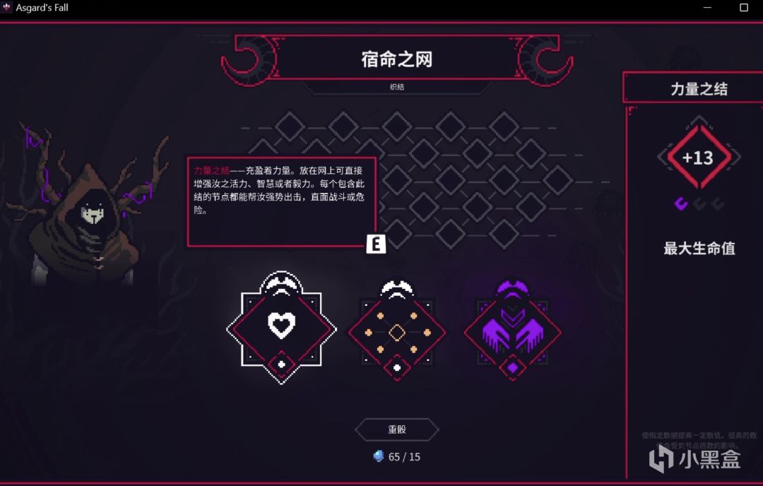 在局内,和常规玩法一样,玩家可以获取经验值升级,选择新的「世界树赠礼」,游戏的中武器分为白蓝紫金四个等级,具体的升级项可以划为降低冷却(也可以理解为加攻速),提高伤害,增加武器数量等,在玩家将两种特定的武器升到5级后,可以合成神器,神器合成不会消耗原来的武器,也不占武器槽位,但只能合成一次,而局内养成的另一部分,“宿命之网”提供力量,命运,回声,可以提高角色的各项基础属性,在此不多赘述。