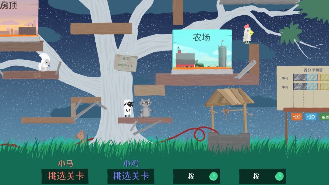 主要玩法是选择你的主控动物,在一个主题场景中,选择一个个”可爱”的道具,在空中铺成一条修罗道,只要在规定时间内活着到达终点,最后得分高者获胜。即使你落后了,也有机会上演绝地翻盘,可以说简单易上手,但也可能易红温易无趣。
