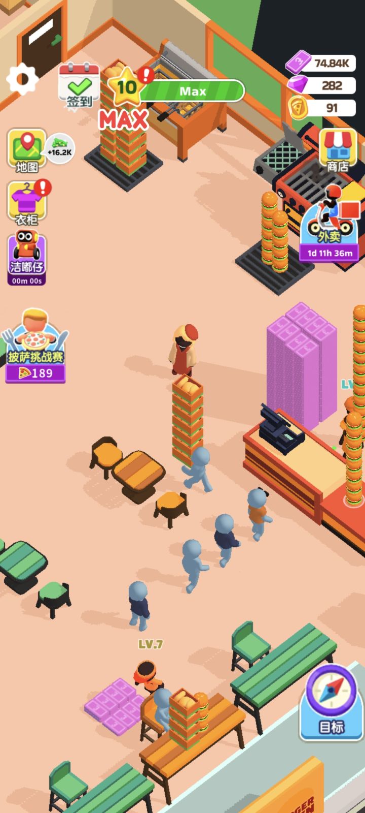 扣一分在必须跳转的广告、不能跳过的披萨挑战赛动画和满地的容易踩上去的道具上。然后是通关纪念。这游戏之前在谷歌上就下过,没联网当单机玩还挺坐牢的。看广告冲那个披萨挑战赛赚钻的话,把员工数拉满、开3钻的生产机器和赚钱收益点满就轻松舒服多了。全场不用啥脑子,框框升级设备就行。