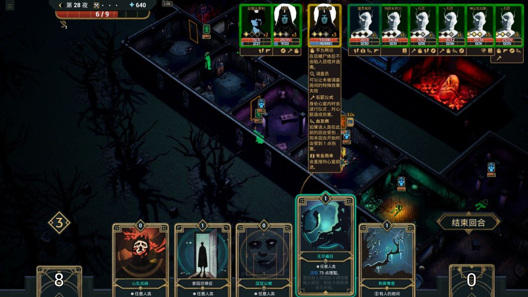 当然这点伤害也就能应付前期客人,中期开始就乏力了,所以群体攻击的“肝胆俱裂”就非常有用,可以将独处人类的周围一圈房间的人进行理智攻击,而且伤害还随着“神经紧绷”的层数而叠加。当然为了保险,我还用“心乱如麻”做一个物理流双重保险。