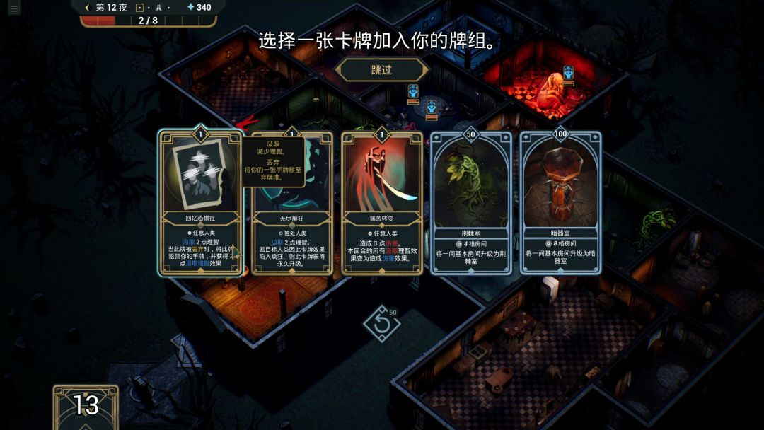 游戏的卡牌基本可以分为两个流派,血量流和理智流。我通关的那几局走的都是理智流,这个构筑的核心在于利用“刺骨寒意”和“幻象室”搭配,尽早给客人叠满“神经紧绷”,这是即使最普通的“家园恐惧症”伤害也能提高到10点。