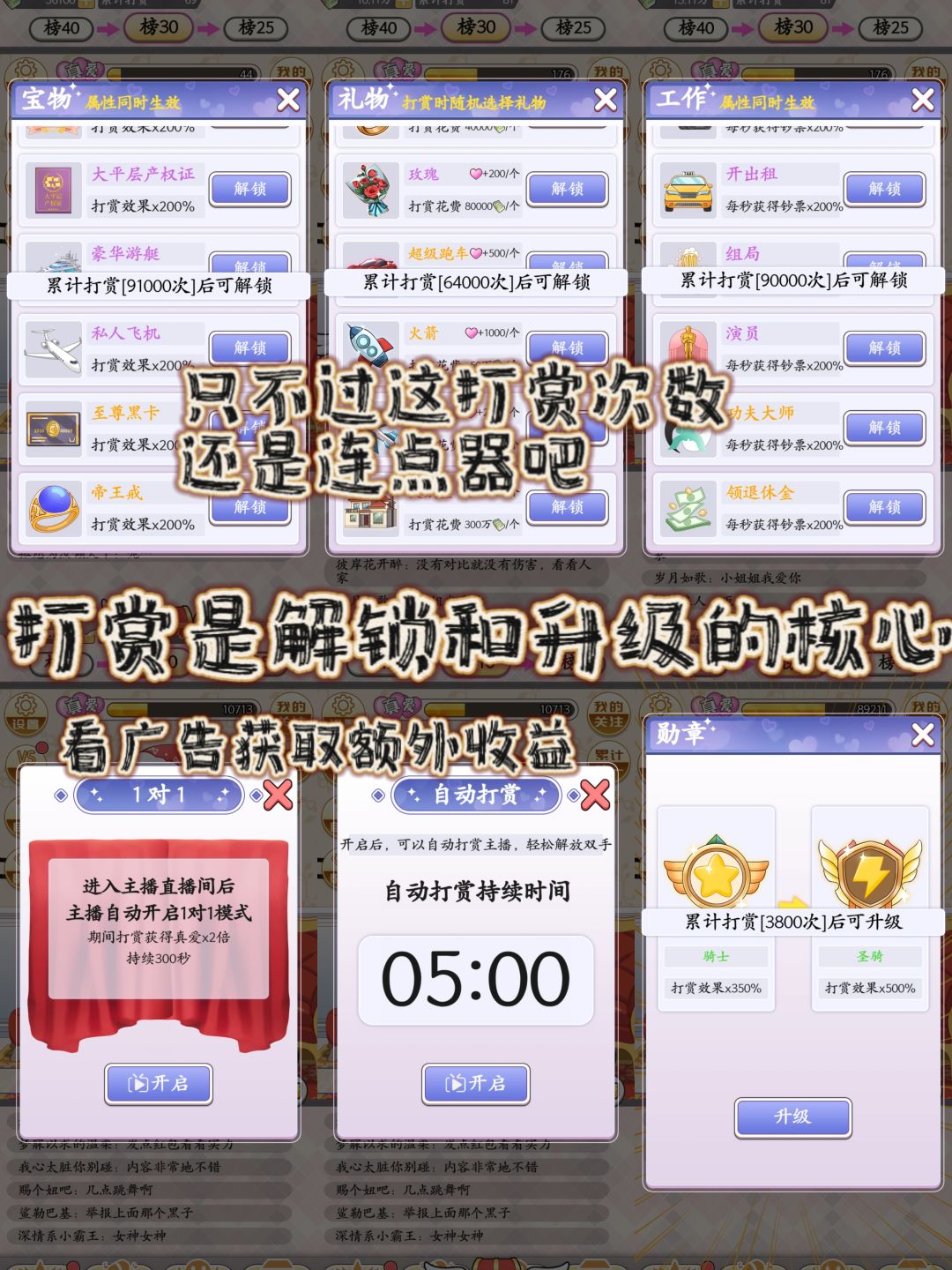 内容玩法上,就是不断的点击进行打赏,打赏到一定次数可以用于解锁升级,但是打赏需要消耗钞票,钞票的获取限制为自动获取与广告获取。