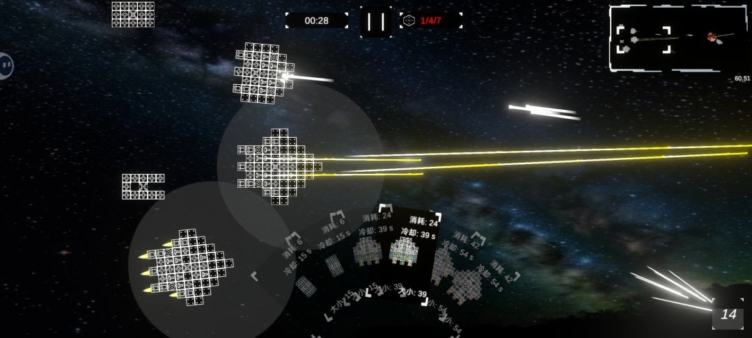 战斗表现力较好,两军对阵的既视感很强,不同颜色的子弹特效表达不同攻击方式,受击后战舰模块有受损表示,以简约风表达科技感很强的战斗,脑补出来的视觉效果很好。