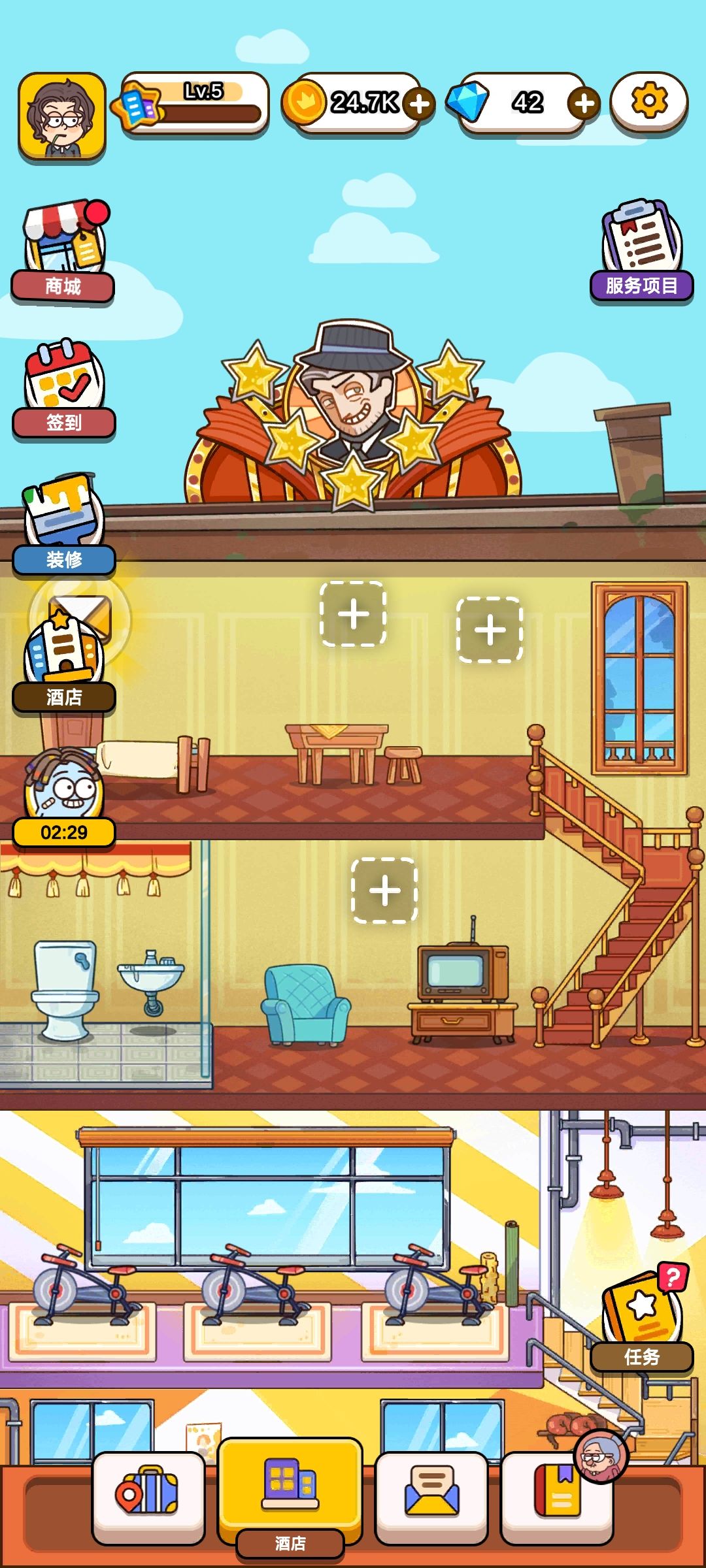 第一次见开屏就是广告的,,切屏再进去也是广告。广告含量比正常游戏多一点。游戏很简单,解谜没有难度,适合新手,还有个找嫌疑人的玩法,这个更简单,只有最后一关不知道为啥那齿轮抽屉死活拉不开重玩了三次可能是个bug。酒店经营没啥新颖的,就是那货物来的也太少了远远跟不上顾客的需求,供不应求还看了几次广告。最后所有谜题都通关了,第一个酒店也开完了,第一个花园也布置完了,虽然一次解谜就要花12个体力但回复的也很快,我急着玩完看了几次广告。可玩性还是有的,比较新颖如果谜题更难一点就好了