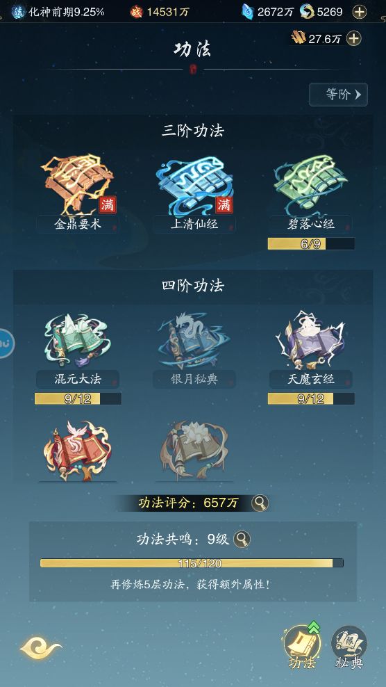 当然,游戏也是有不足的,比如每日妖邪现世不能自动参与,但开放时间确是在饭点,偏偏那五个金辅材还挺重要,每日仙膳也是错过了就没,不给补剩下就是卡资源的氪金点器灵也就算了,不氪金红器灵没歪就算成功,后续纯看天意,毕竟这是游戏主要的氪金点,也是战力最大的差距。但是功法这种真就卡到死了,我到化神了我的三阶功法都没有点满,几十万的功法点都在等功法要诀,这玩意最稳定的获取是500造化的每日礼包,剩下的古宝和神通也卡,但都没这么难以接受