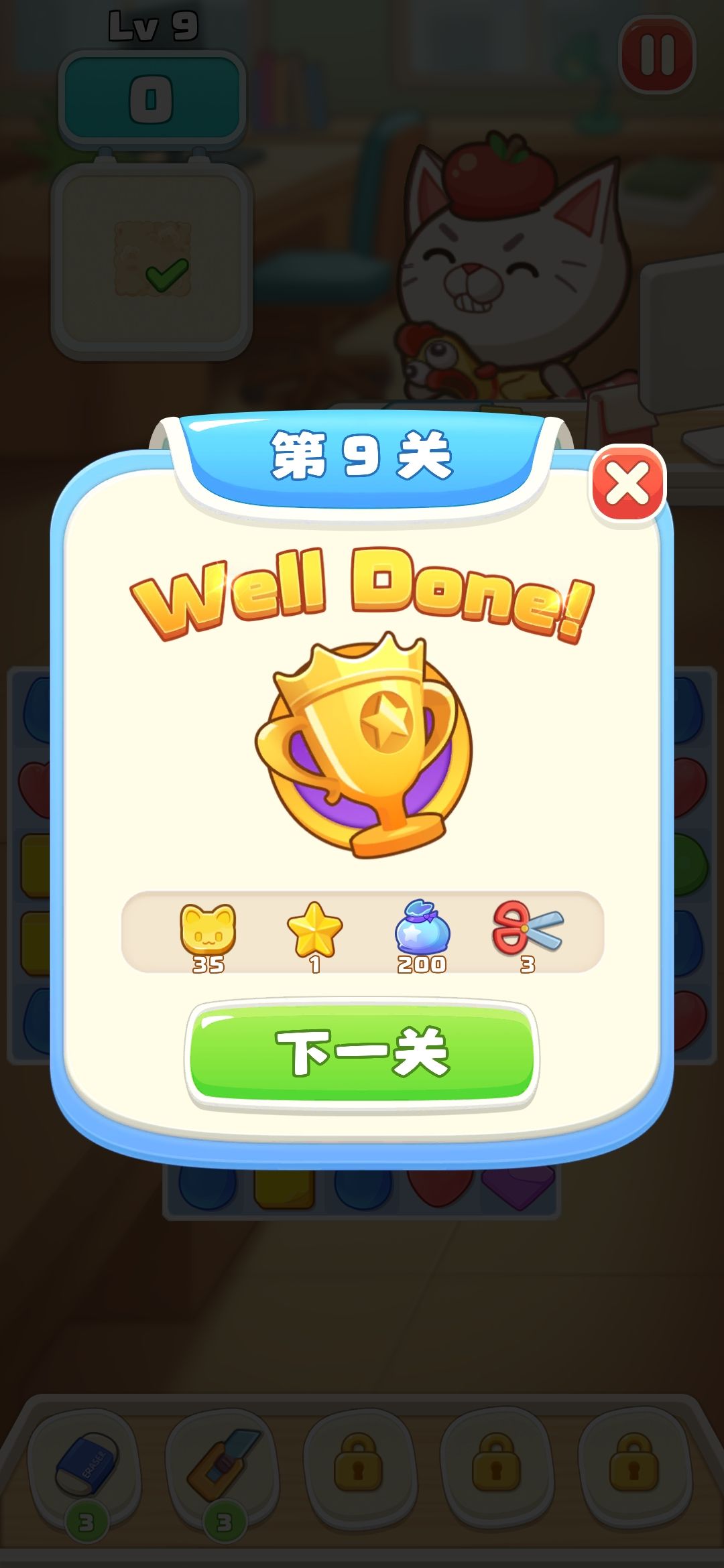 震动设置有点问题,需要打开再关一下。三消闯关推动公司剧情,不是太感冒。如果你玩过宝石战争的话,对此类玩法匮乏的三消根本看不上眼。