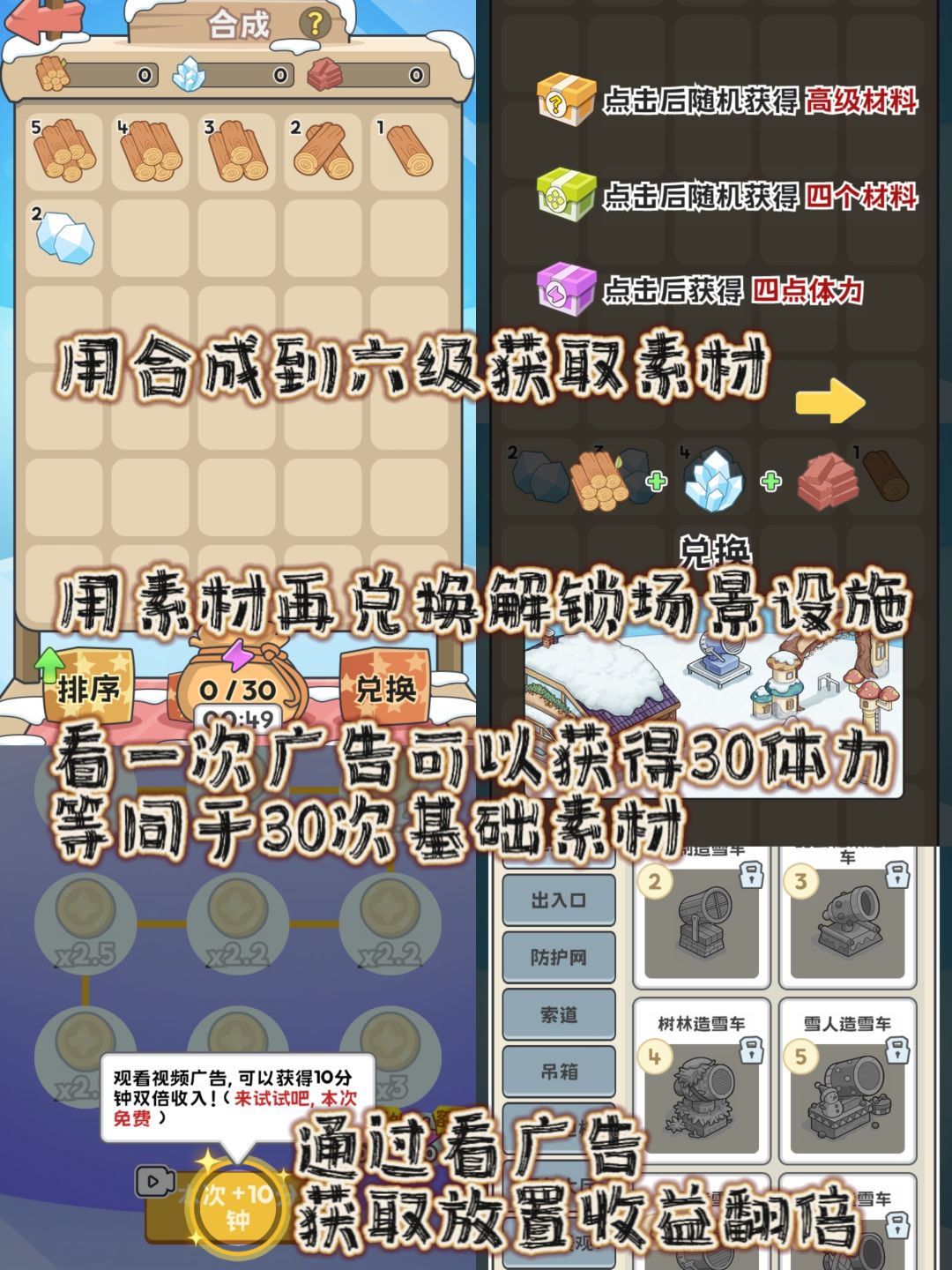 2.广告作为核心的变现收益,是真的各方面功能都要插上一脚,除了典型的待机收益翻倍、广告获取资源等,甚至广告增加放置收益倍数都有了。