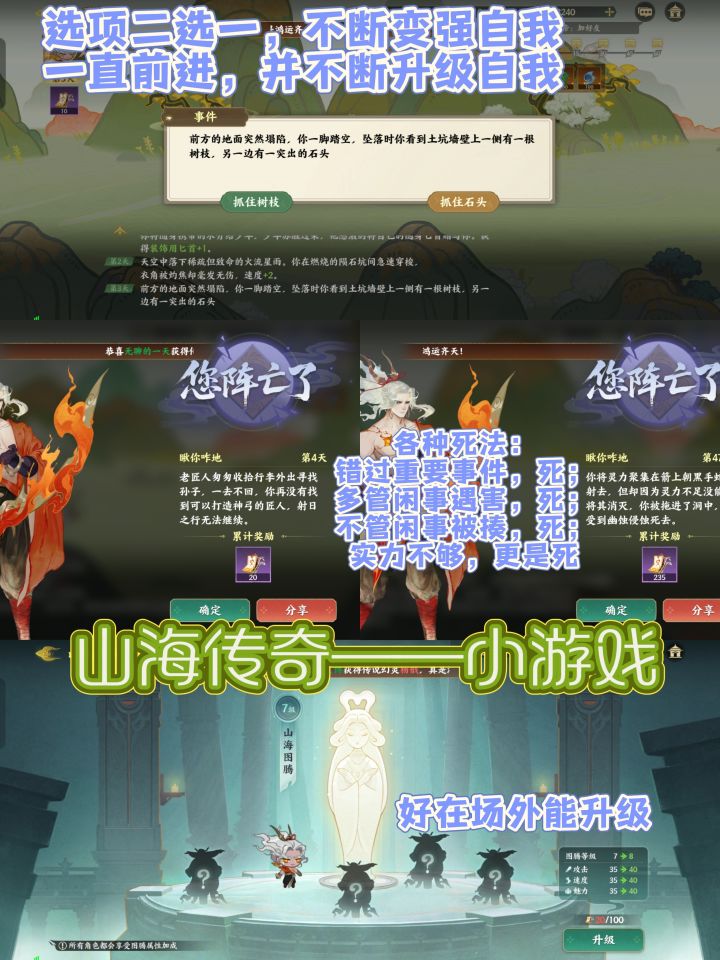 【山海传奇】是个内嵌小游戏,内容上只不过是二选一的不断成长,每次的选项题目可能会变,但答案结果是固定的(不过也是有判定的);只有几个固定节点的题目是必出的。