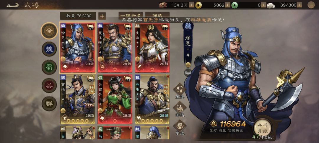 2025.6.28,这游戏好像就等级会卡,然后只能等第二天,其他东西正常打或者挂机都能过。玩了两天感觉曹操是保送升星的,所以个人觉得不充钱玩魏国就行了。现在两个手机两个号都是曹操夏侯渊魏国优先。