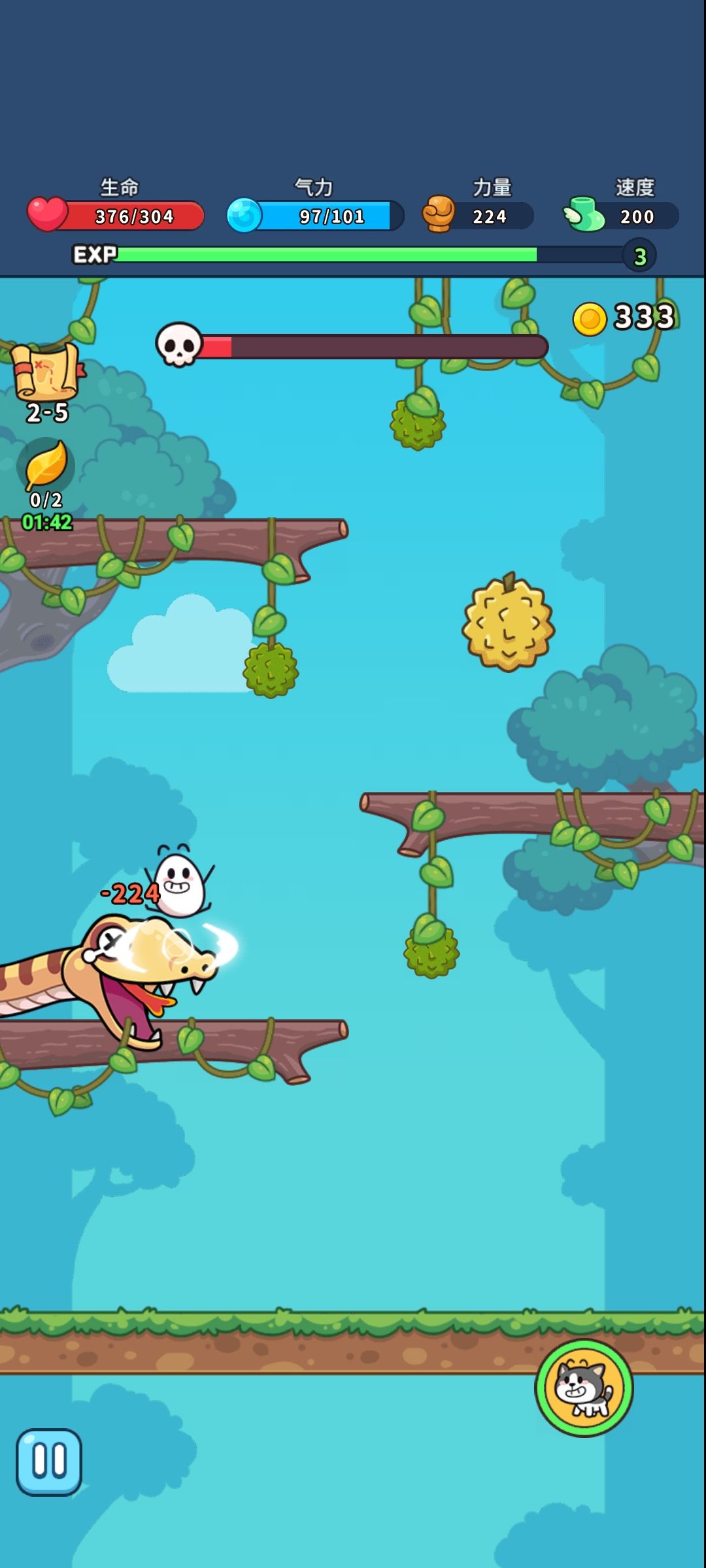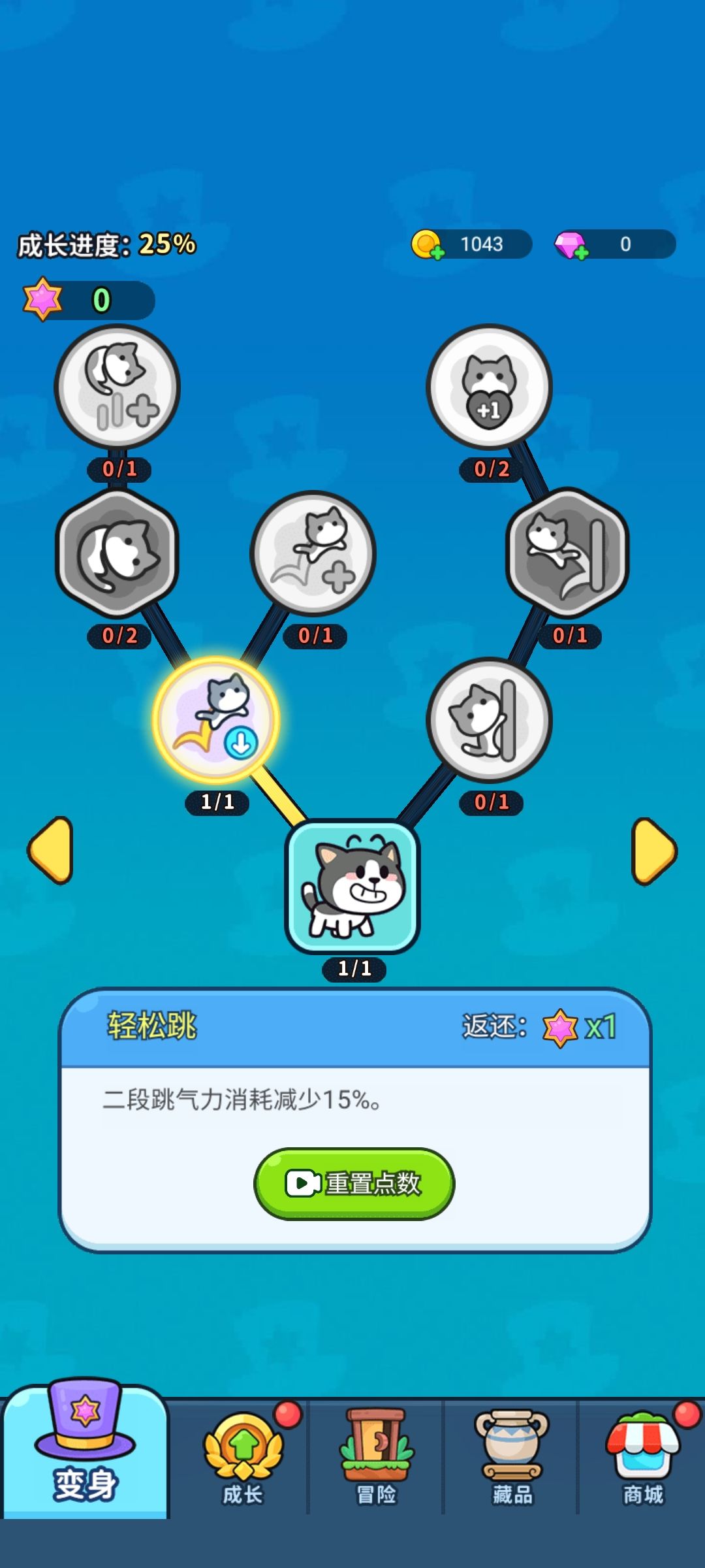 变身可以变成奶牛猫和刺猬索尼,类似点亮技能树,有分支线路选择。点亮所需资源由成长阶段产出,暂无其他获取途径,关卡内倒是可以看广告临时获得使用时间。
