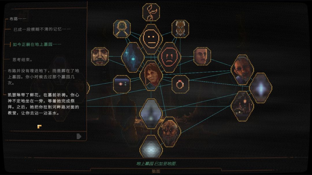 在玩家扮演凯伊的时间段,还会有一个脑图(Mind Map)的模块,一方面是帮助玩家梳理游戏中已经获取到的信息情报,将错综复杂的人物关系更直观地展现出来,让玩家对下一步需要搜集的信息心里有数;另一方面,也是通过这种形式来进行叙事,玩家在脑图界面查看到的信息都是以凯伊自说自话的形式来进行叙述,因为整个故事的叙事节奏非常碎片化,脑图模块在很大程度上降低了玩家理解剧情的难度。