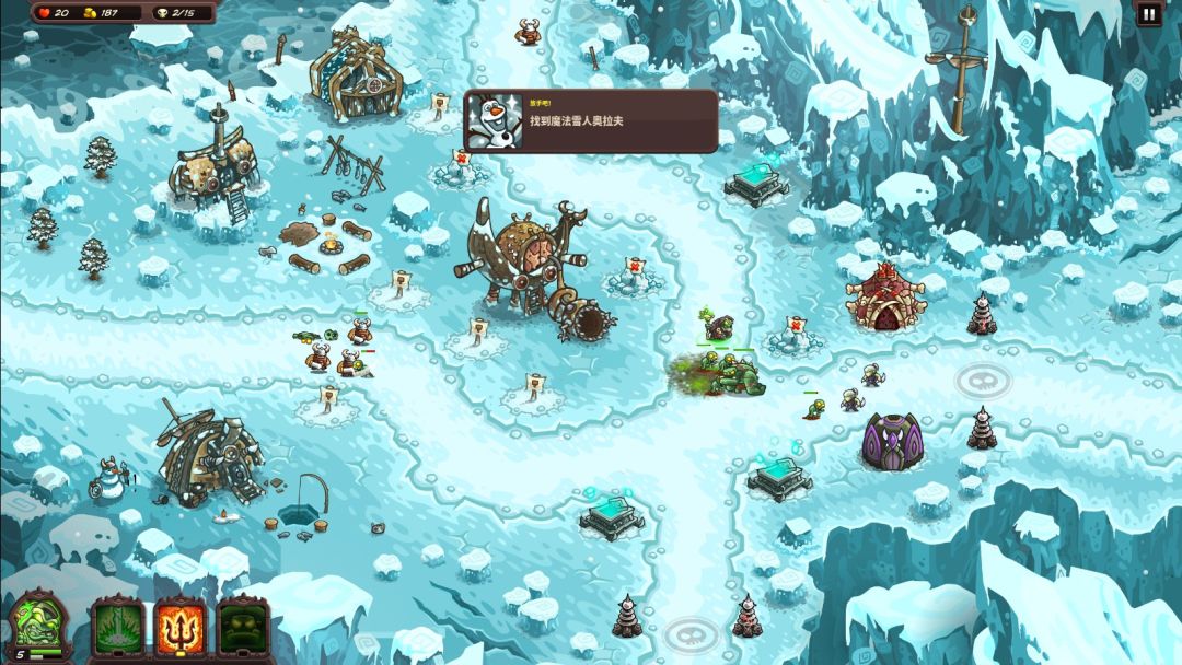 另外,在后期关卡的战斗中还会时不时出现一些特殊情况。比如塔被冰封而无法攻击、塔被根须缠绕而射速变慢且无法升级等,需要玩家去点击那些被影响的塔才能让其恢复正常。这些特殊事件与玩家所处关卡的环境密切相关,比如冰原那一章节的战斗,玩家都是在冰天雪地里与敌人激战,这一章里就会出现塔被冰封的战场事件。