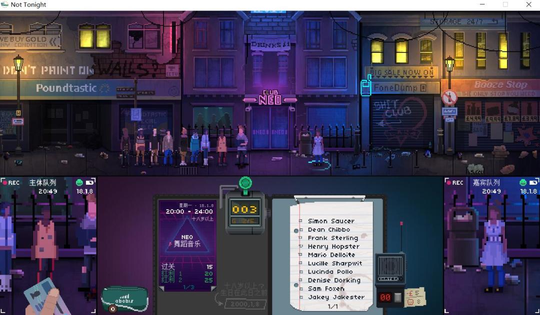 本作的玩法其实挺枯燥的,主角需要每天站在酒吧门口检查客人的证件,没问题的话才能放人进去。每次工作都有工作指标,进酒吧的客人必须达到一定数量,并且不能放太多不符合要求的客人进去,否则工作失误了会扣工资。如果挣不到足够的钱来缴纳各种费用,主角就会面临被驱逐的窘境,生活压力蛮大的。主角会遇到各种事件穿插在主线之中,对其做出的选择将影响主线故事的走势,但以检查证件为主的玩法实在是枯燥了些。