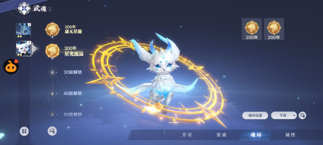 武魂不确定总共多少个,应该会比较符合原著。单武魂有等级、升星、资质、魂环几条养成线,其中升星之后可以获得属性点,在资质界面可自由分配,或者按系统推荐加点。魂环格子数量随武魂等级解锁,可装配魂环年份越高越好,同年份之间有属性差异,有一定组合搭配空间。