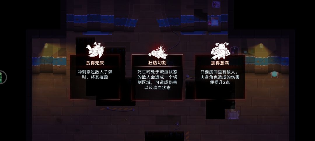 战斗外有养成内容,目前有五个角色,三个可用两个未开放,使用一名角色进行游戏,所获得的经验值也针对这一名角色。等级提升后解锁技能,可以用关卡内产出的资源升级该技能。每个角色总计五个技能槽位,两个主要技能,三个次要技能。
