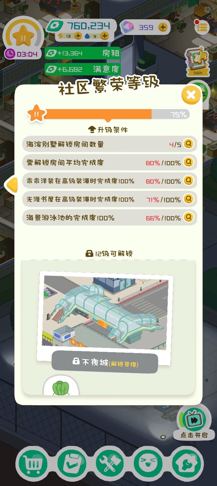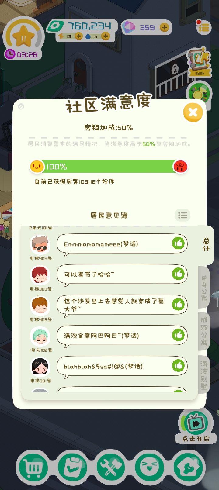🕹️耐玩度:一句话总结就是有耐心的可以玩到最后 没有耐心的当闲下来的时候打发时间也是可以的 到后期一个小时(=现实一分钟)能赚的蛮多的(详见p1)目前玩到12级 海滨别墅只剩一个 有时候升级比较乏味(eg:从10级升到11级的内容只有建造海滨别墅)里面的货币获取途径:收房租,收附加设施的钱,大佬送钱(看广告) 都是越到后面越多🌃画面音乐:画面和音乐很是很不错的 里面的小人很可爱 BGM倒是挺治愈的 成双公寓的附属建筑社区花园里还会传出猫叫 总之挺可爱的