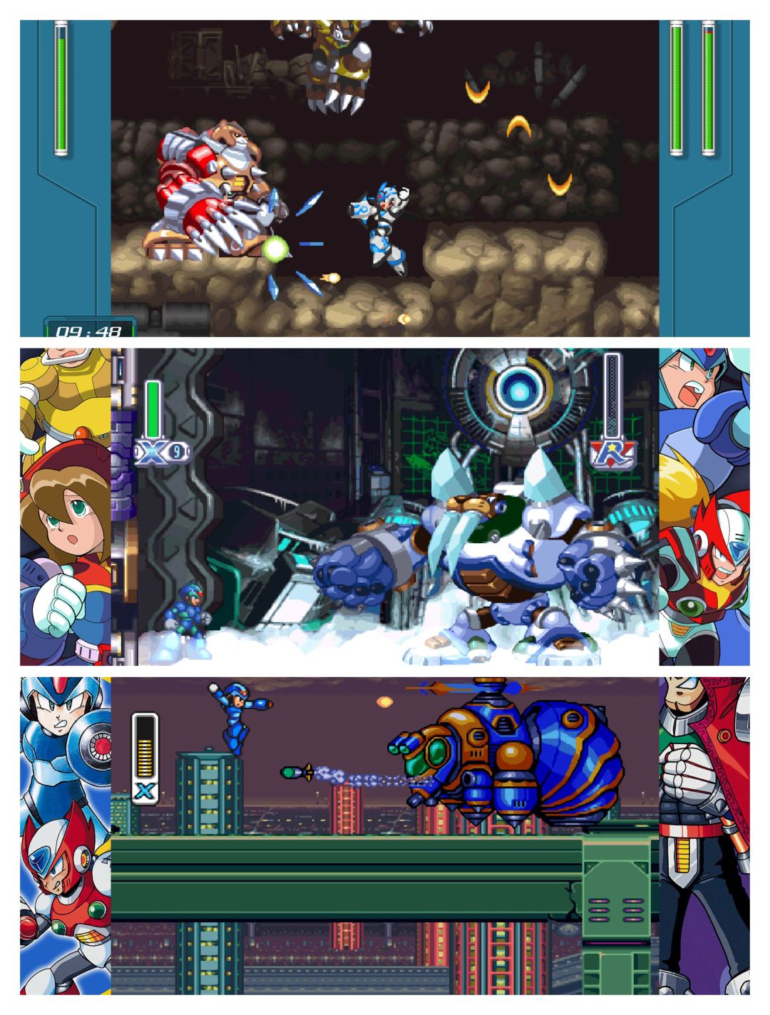 到了x3里面,可以说x进化的很强了,而且还首次加入了人气角色zero,刚开始就能使用,而且体力最大,能二段跳,三段蓄力还能使用z光剑,直接打谁都是半管血,不过只能作为支援使用,而且无法和x一样装备盔甲和获得特殊武器,后期x也可以拿到zero的光剑,不过需要完成特定的要求才行,另外x3里面的腿部装甲,不但能空中冲刺,还能往上方冲刺,而且x3后期还有装甲强化,可以给四个部位四选一进行强化,腿部可以两次冲刺,手部可以四段蓄力,而且还多了一个技能,身体是防御力四倍,头部是静止的时候回复体力,而且更逆天的是,人物体力回满后,还能回复e罐的,可以一口气把4个e罐回满,另外x3虽然没有和街霸联动,但是可以在后面一个关卡拿到隐藏的黄金装甲,虽然难度很大,但是黄金装甲是可以同时对四个部位进行强化的,非常逆天,拿到了黄金装甲,到boss前一个房间,把所有e罐回满再去打boss,加上四倍的防御力,根本就死不了,硬刚就行