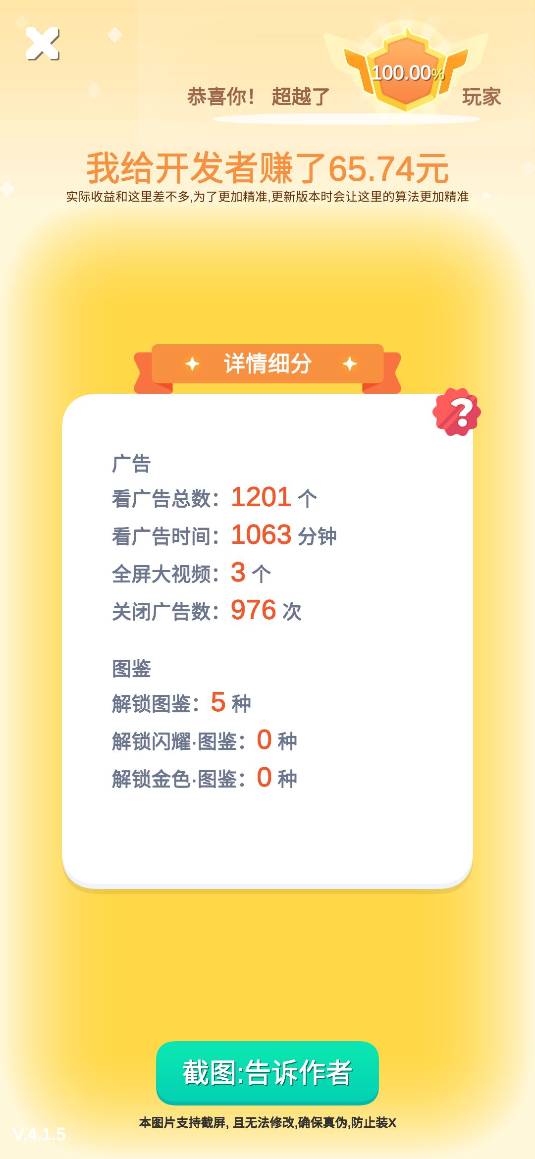 玩了这么多游戏 这还是第一个任务给出评价的游戏 莫名其妙的给作者赚了65r😄(能不能分我2r)💡游戏创意:太有创意了 成功的填补了手机里找不到广告的空缺😄 可以说作者在创新这一块领先别人一大截🪄耐玩度:不好说 爱看广告的来🎮可玩性:我真的一定要写这东西吗😅最后问个问题:你们都阴的没边了是怎么阳的😄