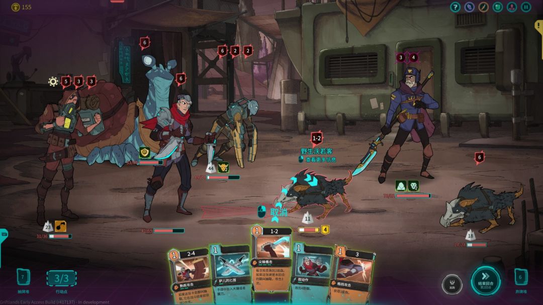 在这种从立法则的环境中,战斗时常发生。这里的战斗分为两种形式。一种是武力形式的,其战斗模式和玩法都与《杀戮尖塔》有几分类似之处。卡牌有费用的概念,玩家每回合的费用也是有限的,通过科学地构筑卡组,以及合理利用每回合的费用,来提高自己的战斗力,策略性很强。在这个过程里,玩家需要通过任务和剧情来赚取金钱资源,以便在商人那里购买心仪的卡牌已经删除不需要的卡牌,合理优化自己的卡组。