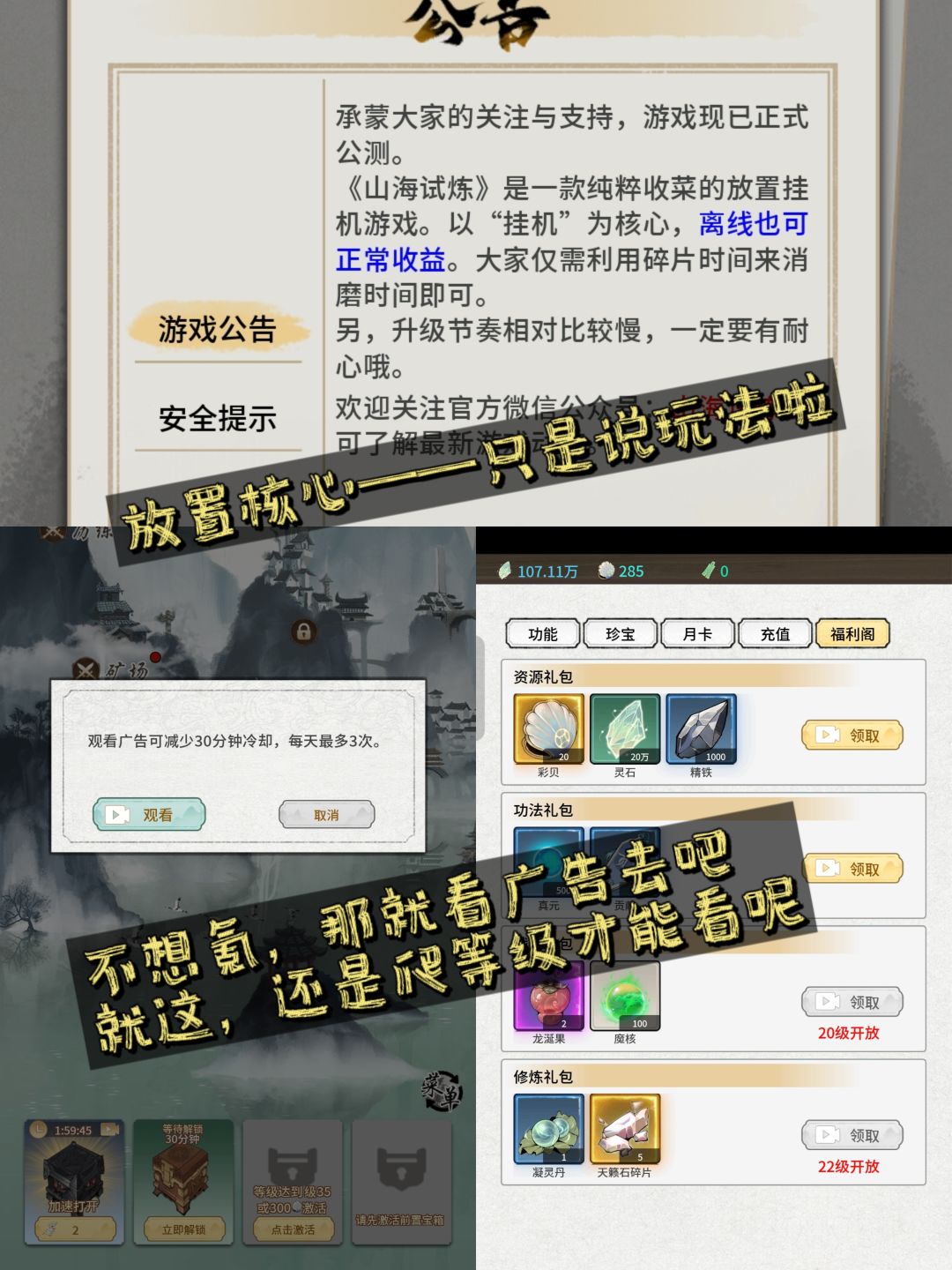 内容上,开局经典铺个世界观叙述,说是女娲除妖被妖惦记,无奈下传五行于人间让人们修炼,之后便是玩家自己的修仙放置路了。