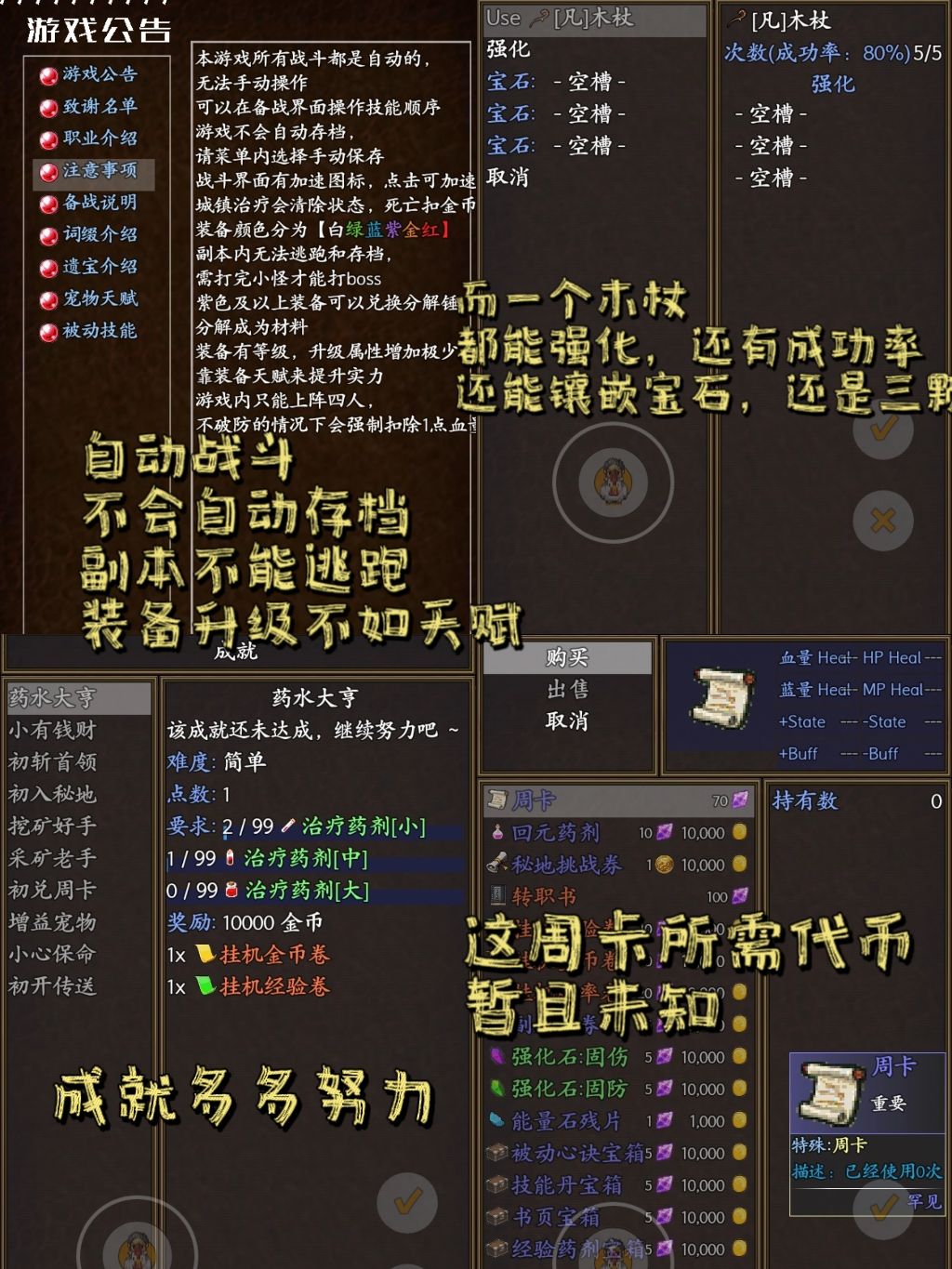 自动战斗、不会自动存档、副本不能逃跑和存档、打完小怪才能boss、装备升级不如天赋实力。