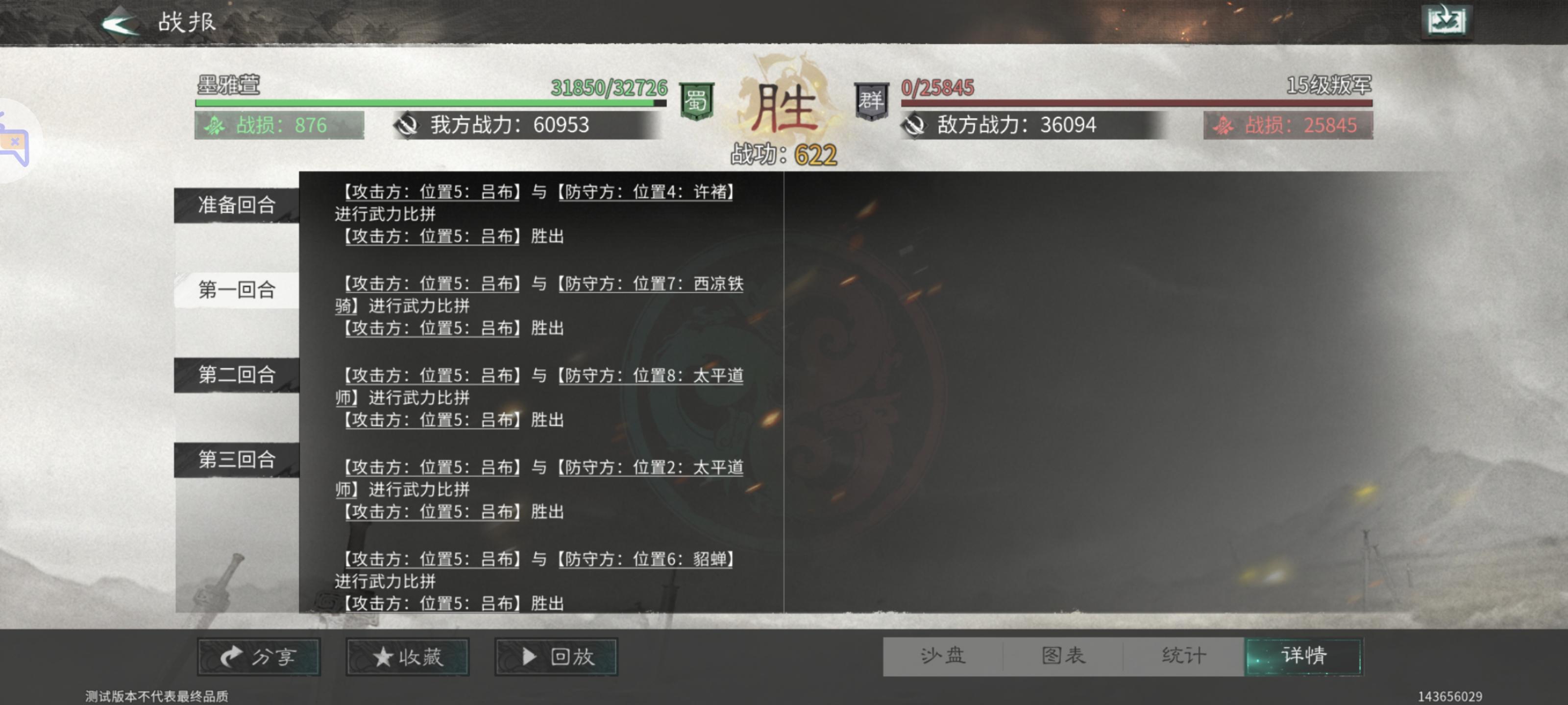 手机9小时 电脑模拟器也有差不多的时长,虽然时长没多少,但我也凑凑热闹评论一下,玩法做出了一定的创新,部队搭配是九宫格3武将+3士兵,外加1神器辅助效果,技能是自带天赋技能+主动+被动+追击技能。技能这块每个技能都有主动被动和追击选择一种进行装配,这点新手刚上手可以研究琢磨一番,毕竟对技能不熟 武将天赋技能也是,不过正式上线最好不要锁死阵容抄作业,希望每个阵容都各有长短。武将升到紫能改追击格,这个不推荐不然追击线就没多大意思了,最好改每个武将升阶可以解锁更换固定的方向 而不是随意。测试,元宝很多 抽卡不是问题 不知道正式上线会怎么样,战报的话没用的地方太多 看下数值和增伤几率都要翻一大堆 战报借鉴下其他slg就好了 没必要整这么麻烦游戏中武将立绘不错,都是动态的,美术是下功夫的,周瑜和孙策是我最喜欢,游戏玩久了感觉有点单机,玩久了有点腻,在自己国家来回转,打架的话也是呼呼啦啦扎堆,我感觉做成汉末霸业那种买断的也不错 多出些玩法和新奇的搭配希望早日上线,祝越做越好