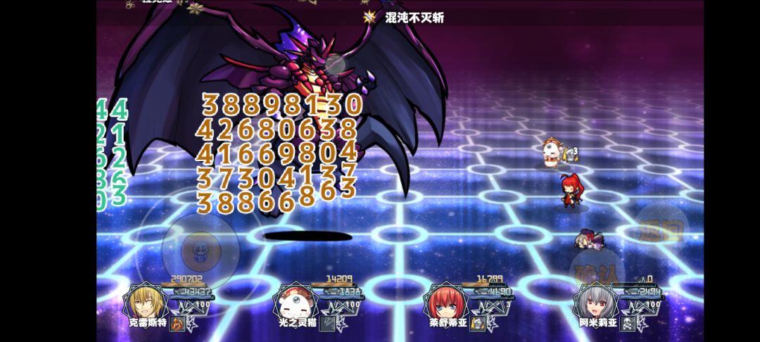 最后通关截图,一回合干2亿,boss根本打不动我们,而且这游戏,对方都没有速度系统,我其他三人没练过,都才200级,结果永远是我方全员先动。