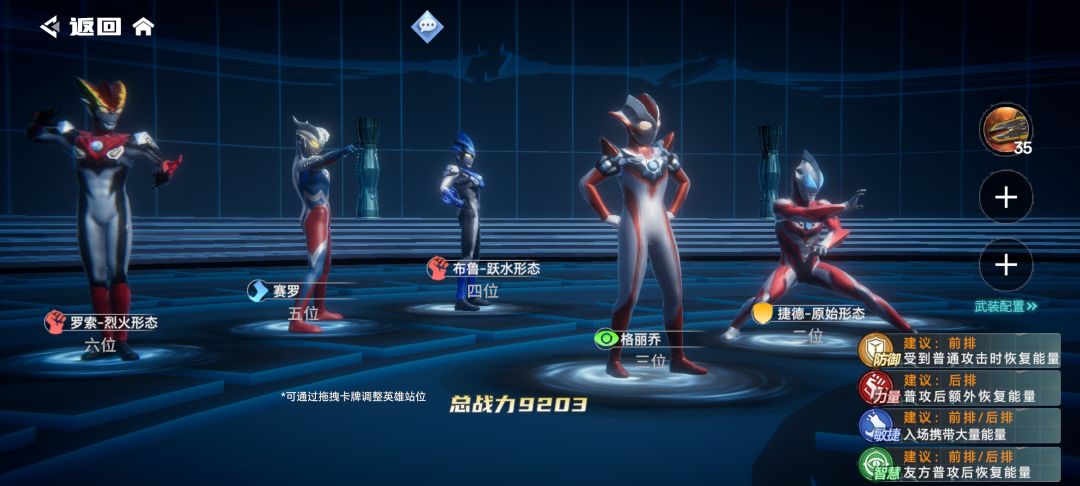 英雄总计43人,包括光之国、多宇宙、怪兽、宇宙人四个阵营,分蓝紫金三个品级,金色传说最高。上阵六人,外加三个武装槽位。单个奥特曼有等级、品级、进阶三条养成线,不同奥特曼之间还有羁绊效果,战斗中可以发合体技。