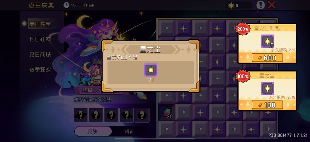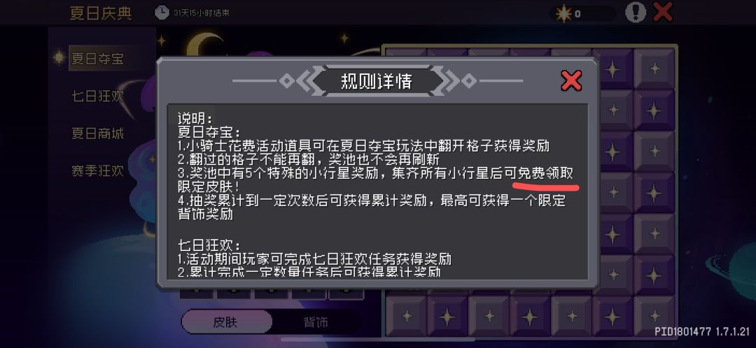 再说818更新的活动,夏日庆典。先说这个皮肤,一个活动详情写的是集齐所有小行星免费获取限定皮肤,然后就是7×7=49个格子,通过活动只能获得10个。也就是要十抽内再49个格子里抽到五个小行星才能拿到这个免费皮肤。背饰是累计40抽能拿,600鱼干可以买十抽且限购两次。后面是100鱼干一抽,也就是1000鱼干十抽。加在一起就是220元拿背饰。如果运气不好还要再补90元拿皮肤(可能算错了但是大概就是300元),那我问你凉屋,没有技能特效特殊表现,你卖300?!隔壁王者无双300做不好都要挨骂你这像素小人300啊?免费送能吸引回流,六元交朋友,三十元支持一下,300元这是?策划定价的时候是不是喝多了?质量够300吗?工作室肯定要收入,但是游戏做不好玩,氪金得到的收益还要被暗削看策划脸色这是不是有点扯皮了。