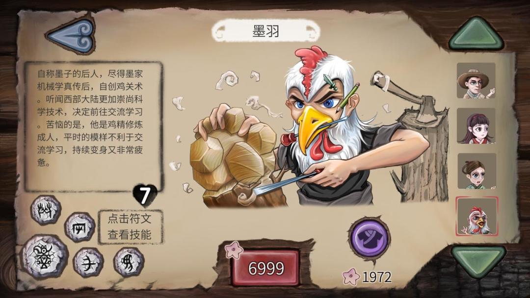 这款游戏虽然没有局外成长系统,但是每局打完都能获得不少点数,点数积累起来可以解锁新的主角,比如长相和技能都非常魔性的“鸡哥”墨羽。