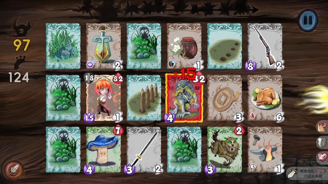 主角每回合必须走一步,不能不走,也不能多走。同时,主角每走一步,相邻的格子的卡牌会跟着走,然后导致整个棋盘战场上的局势发生牵一发而动全身的变化,关键是每一次冒险都不一样(没错,这也有肉鸽机制),这个游戏的核心玩法真的非常有技术含量,想玩好真的不轻松,甚至还十分烧脑。游戏中还会有一些小型副本,本质上都是基于核心玩法机制的解谜,硬拼是没有任何胜算的,只有利用副本特有的机制才可过关,挑战性更大。