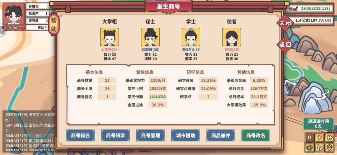 三,刷贡献,建商号。①商号要建立,要你这个村(镇,县,郡,州)有足够的贡献,还得要一笔不菲的资金。前期刷贡献就主要是做任务,任务找着自己能送的商品尽量接高贡献的任务,城市级别从小到大接任务。我是跟着人机的进度开的,他开啥我就开啥。②每个商号的掌柜必招,学士和大掌柜尽量招,人不够的时候学士可以和谋士换着用。③前期由于掌控值过少,加上用人费用,总体上是亏钱的,并且可能商号常年垫底,这都是正常现象,问题不大。