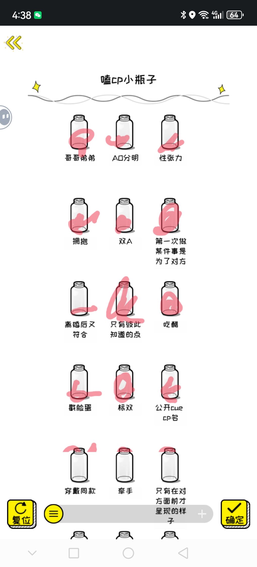 1.没有橡皮擦,需要撤回才能删除不小心画错的瓶子。2.没有声音,不过这个无伤大雅,因为核心就是画瓶子。3.有很多瓶子无法点开,虽然有广告的标记但没有广告,而且也不能点开。4.有点无聊,也不能自创瓶子。只能按照给的瓶子来画自己的兴趣。5.以下图片为我画第二篇瓶子的场景,第一次画瓶子是好好的,但第二篇开始就错位了。有可能是我卡了,但因为画瓶子有点无聊所以我就没有重进。