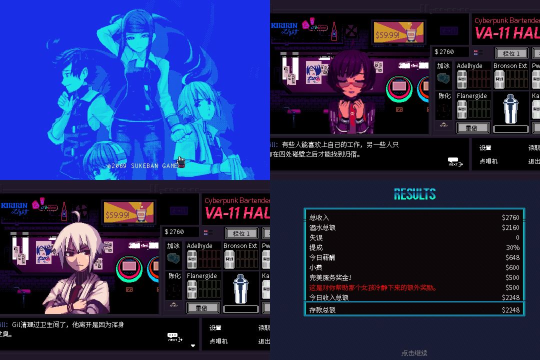 是蛮喜欢它的游戏模式和界面的,调调酒聊聊天本来应该很放松的,它非常适合喝点饮料吃点零食慢悠悠的玩,所以对于我这种玩游戏都有比较强的目的性的人来说,它的叙事很散,除了调酒也没有其他的娱乐性,赛博朋克的背景我也是第一次接触,就特别容易没耐心,感觉有点坐牢,所以也没玩完,玩了一半左右吧