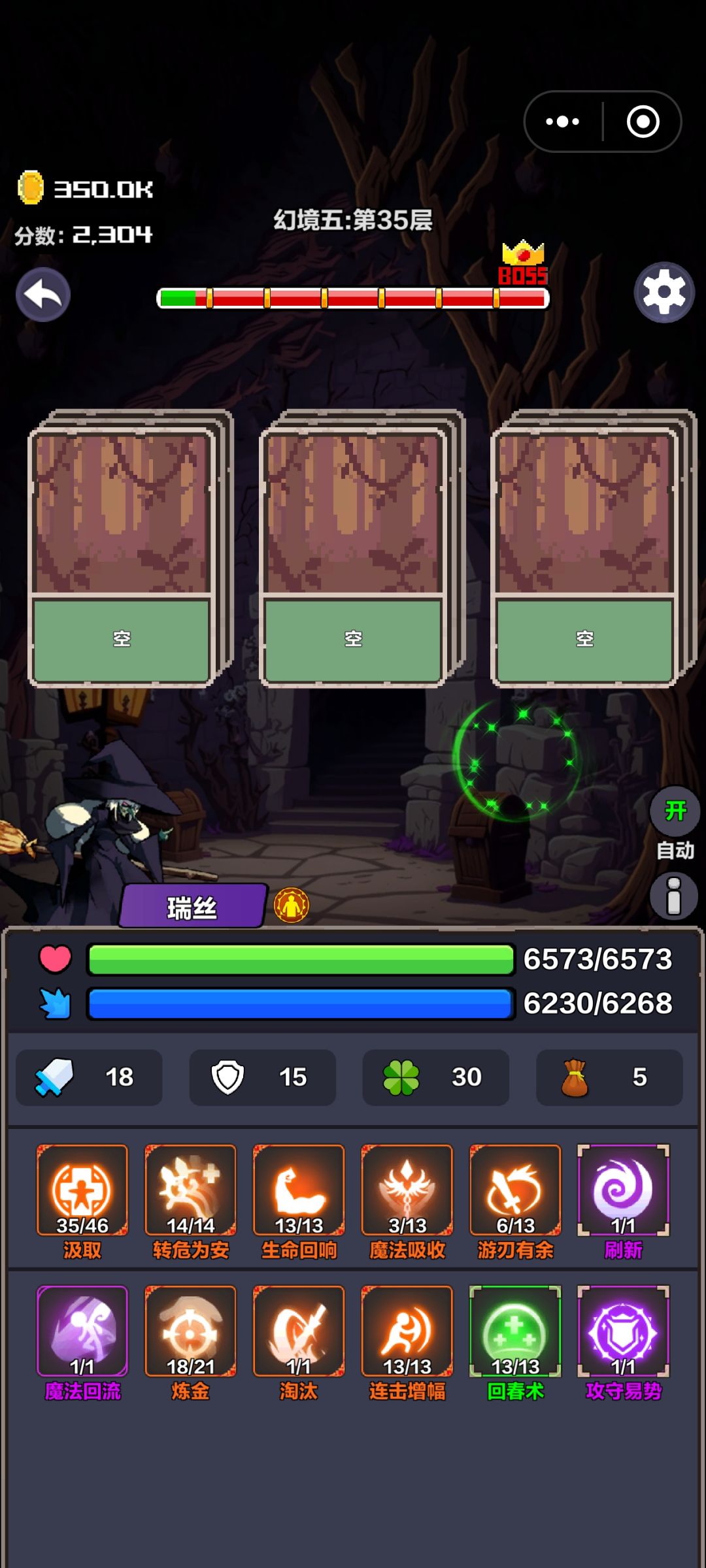 看图说话:前期带一个刷新,碰到boss就刷新,不打BOSS叠血和蓝上限,刷幸运,刷宝箱,杀六十怪出上限果实,提升上限的时候,手速一定要快速连续点击确定按键,可以多次提升上限非常有用!主要是汲取:叠血和蓝让怪打不动你,还有炼金:钱多了直接刷商店就行。炼金都一定程度就可以了,不缺钱了,打boss限制回血,回春术可以提升上限一次回4/5的血,残及满好用,刷新打不过就跑,但是有攻守易势反转boss攻击护盾,就好打多了。