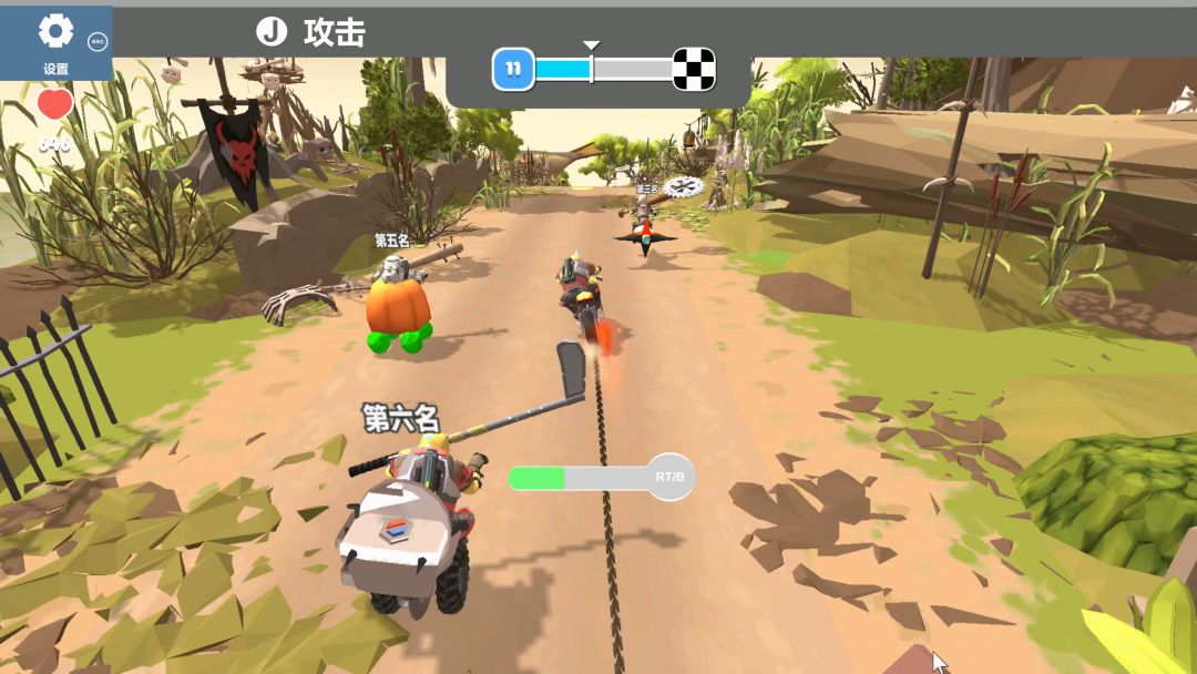 同时也会和游戏中的其他车手一起竞技,可以使用各种手段对同排或者后方的车手进行干扰,同排车手的话可以直接按J进行攻击,开始没什么武器,就是用腿踹,不要要掌握好提前量,而且踹了一脚后还要等一等才能踹第二下,后面可以在商店购买武器,上到棒球棍下到曲棍球棒,尤其是这个曲棍球棒,够长,伤害也高,范围也大,简直就是一个最佳的神兵利器。