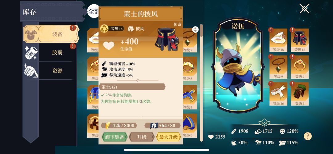 5.装备有多种组合效果。我比较钟意“策士”,能增加技能次数,其他都差不太多了。词条建议堆攻击速度和移动速度,堆高了以后,攻击僵直明显好转,加上闪避的话,操作还是比较丝滑的。