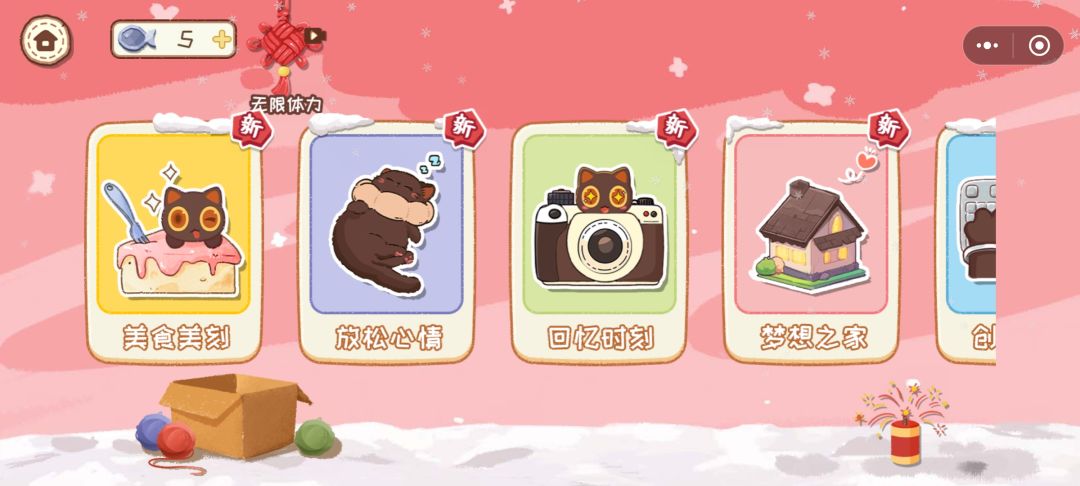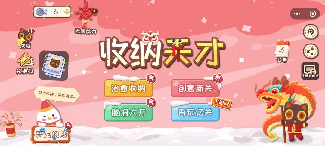 纯休闲小游戏,内容倒是挺丰富的,包括治愈收纳、创意新关、脑洞大开、再玩亿关、智力挑战几个玩法,都是市面上已有的玩法,只不过美术表现方面比较优秀,看上去有趣味性。
