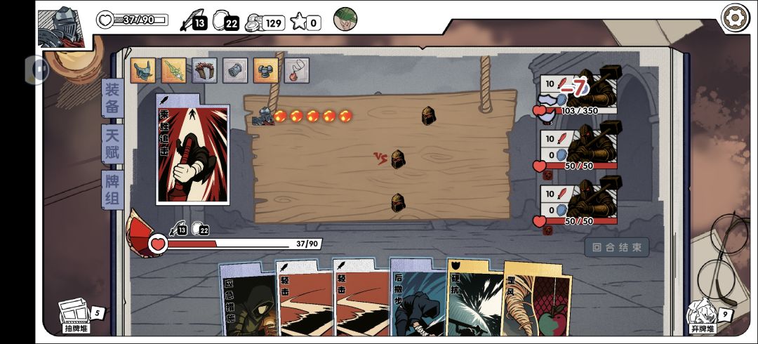 第二个吃装备,五个部位的装备,人品差的时候一直集不齐,回血靠装备,靠卡牌,不过多几件装备,基础属性高