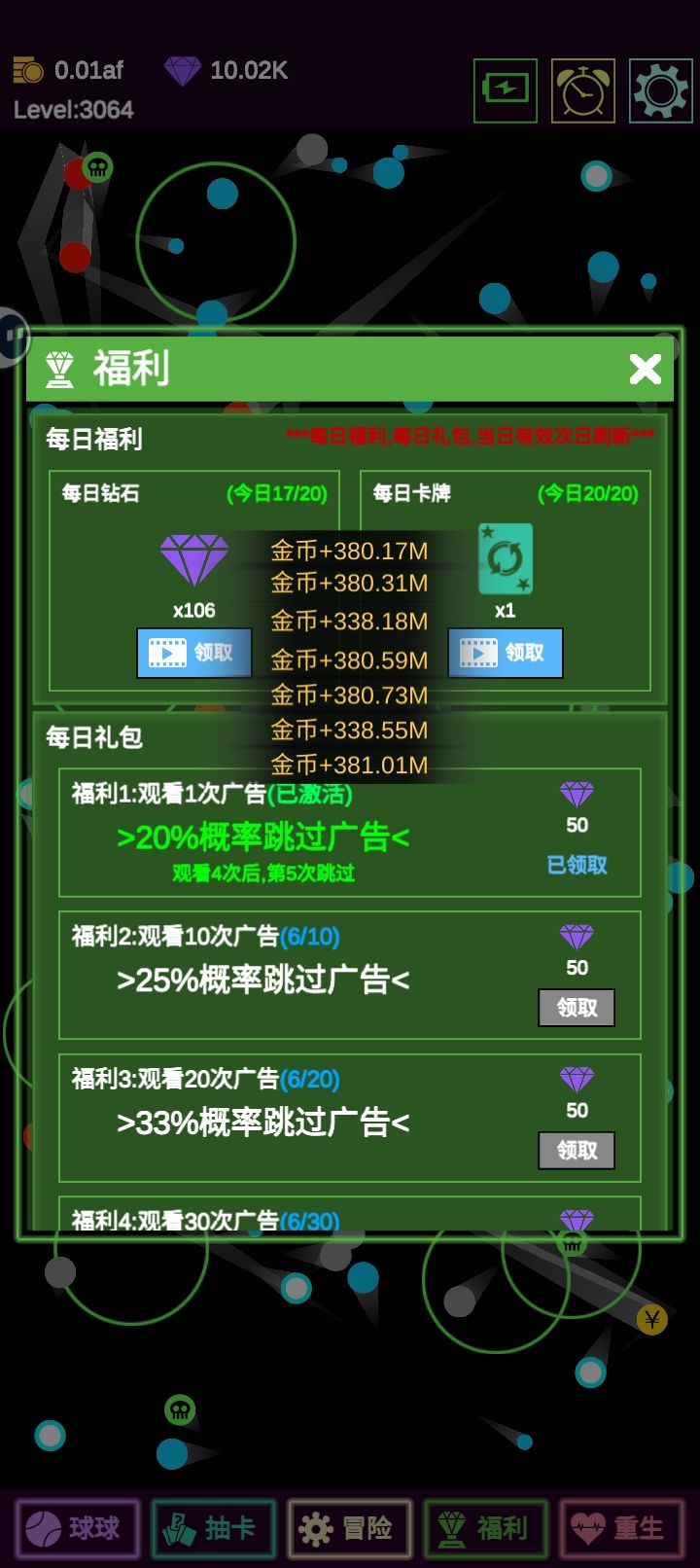 玩了一天还是挺休闲的在打下免广告会刷新的时候还是有点不爽的不过也算能接受。不过……后面bug了!!!!钻石可以无限刷了,一开始还算高兴……然后无奈发现除了刷钻石啥都干不了了,重生会卡死,没有砖也没有球……抽卡界面也只能解锁卡位(因为看一早上广告所以卡都抽完了,后续其实完全不缺钻石),重启资金会变回1000/100不过领取一次钻石后会变回来,但也仅此而已了……