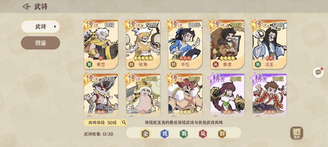 怎么说这游戏呢,不好不坏的,游戏性是有的,只不过养成周期很长,抽卡几乎保底,而给的又都是蚊子腿。玩儿了三天,零零碎碎连福利带推关卡抽了三百来抽,没见过红将,次次也都是保底,具体的养成了哪些人物,也就如下图所示。